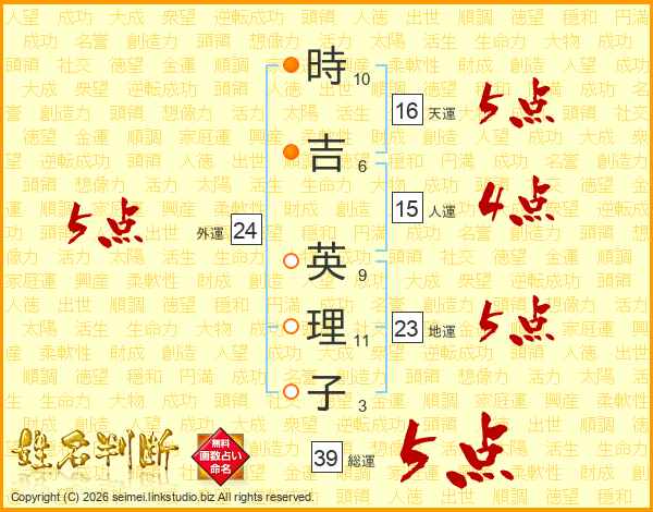 時(10画)吉(6画) 英(9画)理(11画)子(3画)