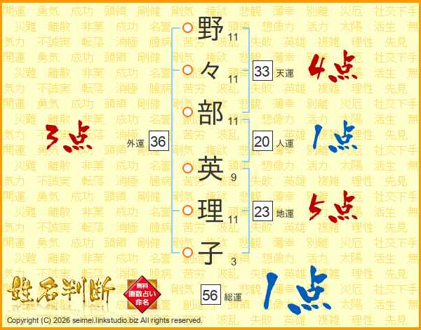 野(11画)々(11画)部(11画) 英(9画)理(11画)子(3画)