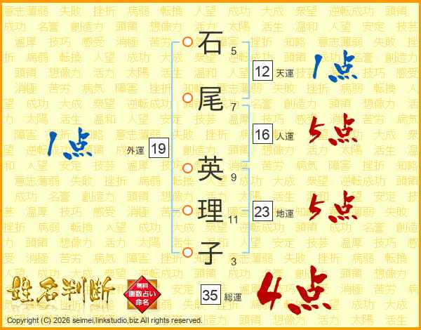 石(5画)尾(7画) 英(9画)理(11画)子(3画)