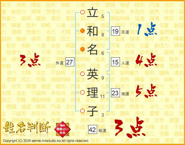立(5画)和(8画)名(6画) 英(9画)理(11画)子(3画)