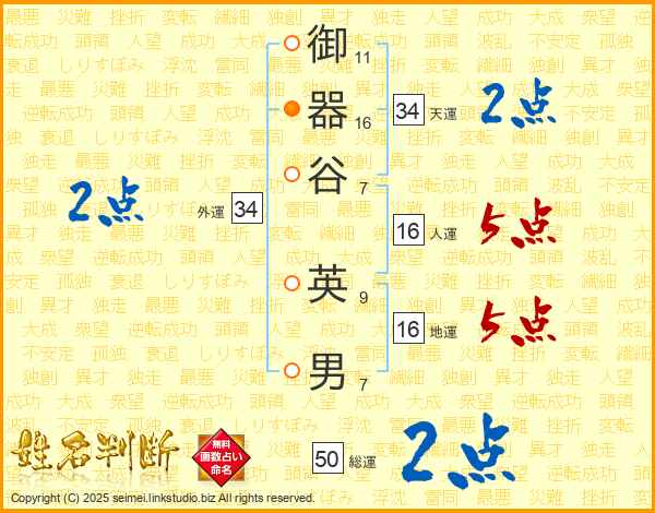 御(11画)器(16画)谷(7画) 英(9画)男(7画)