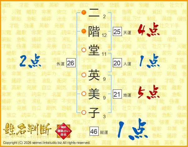 二(2画)階(12画)堂(11画) 英(9画)美(9画)子(3画)