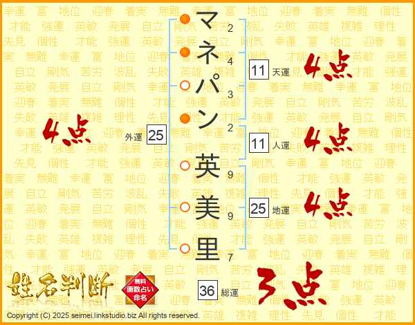 マ(2画)ネ(4画)パ(3画)ン(2画) 英(9画)美(9画)里(7画)