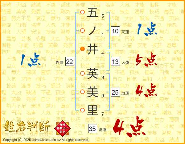 五(5画)ノ(1画)井(4画) 英(9画)美(9画)里(7画)