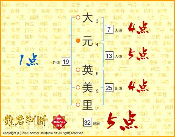 大(3画)元(4画) 英(9画)美(9画)里(7画)