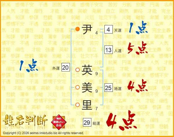 生活面を象徴する運勢です。外部から受ける影響力を表し、結婚運、家庭運や職場、環境への順応性を表します。総運から人運を引いた画数。姓や名が1文字の場合を除く。