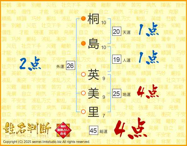 桐(10画)島(10画) 英(9画)美(9画)里(7画)