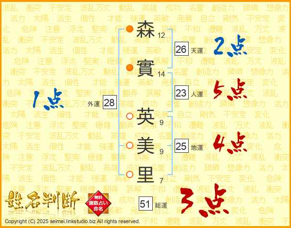 森(12画)實(14画) 英(9画)美(9画)里(7画)