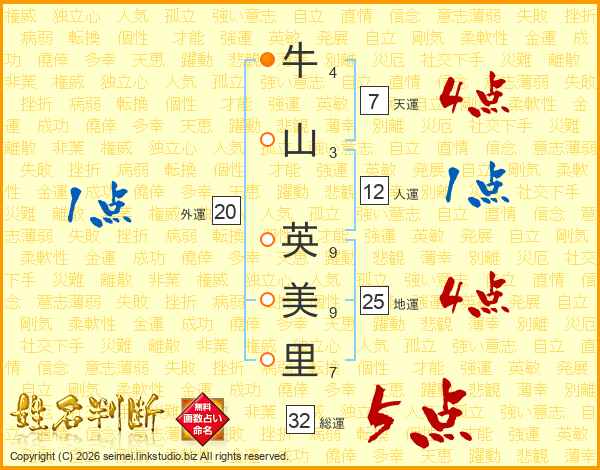牛(4画)山(3画) 英(9画)美(9画)里(7画)