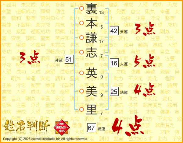 裏本謙志英美里さんの総運は67画の4点!
