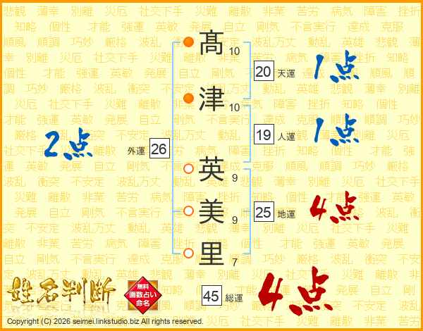 髙(10画)津(10画) 英(9画)美(9画)里(7画)