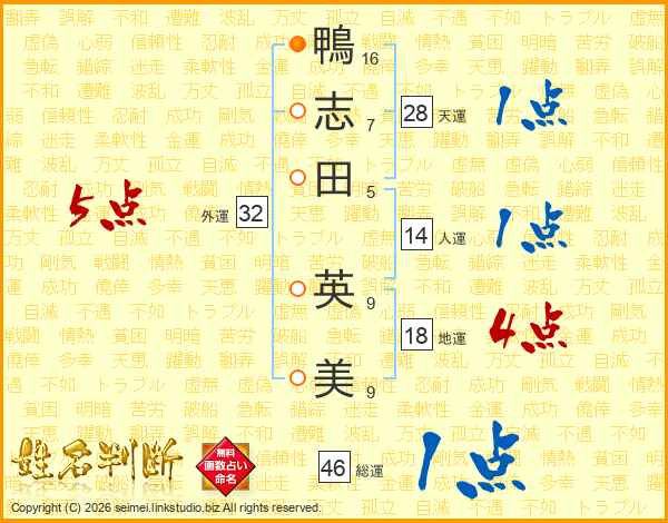 鴨(16画)志(7画)田(5画) 英(9画)美(9画)