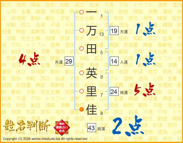 一(1画)万(13画)田(5画) 英(9画)里(7画)佳(8画)