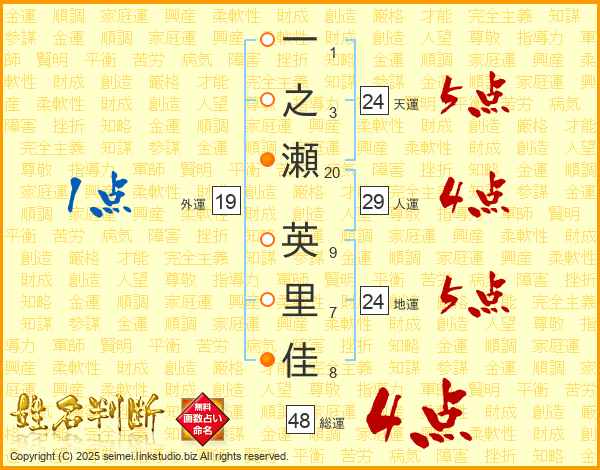 一(1画)之(3画)瀬(20画) 英(9画)里(7画)佳(8画)