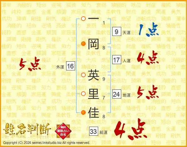 一(1画)岡(8画) 英(9画)里(7画)佳(8画)