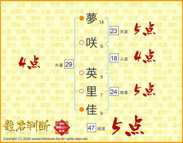 夢(14画)咲(9画) 英(9画)里(7画)佳(8画)