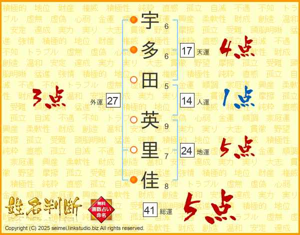 宇(6画)多(6画)田(5画) 英(9画)里(7画)佳(8画)