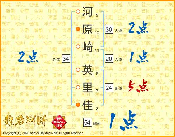 河(9画)原(10画)崎(11画) 英(9画)里(7画)佳(8画)