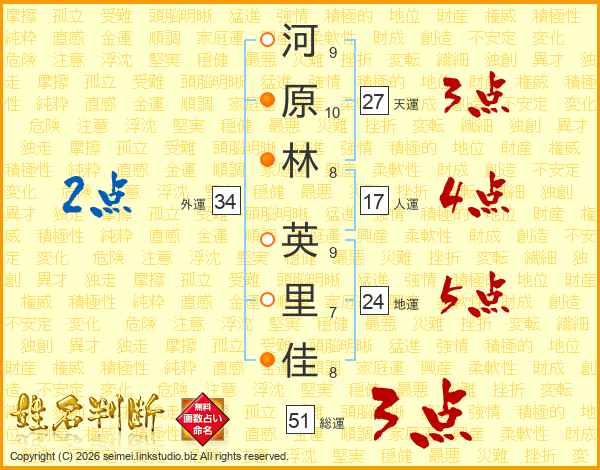 河(9画)原(10画)林(8画) 英(9画)里(7画)佳(8画)