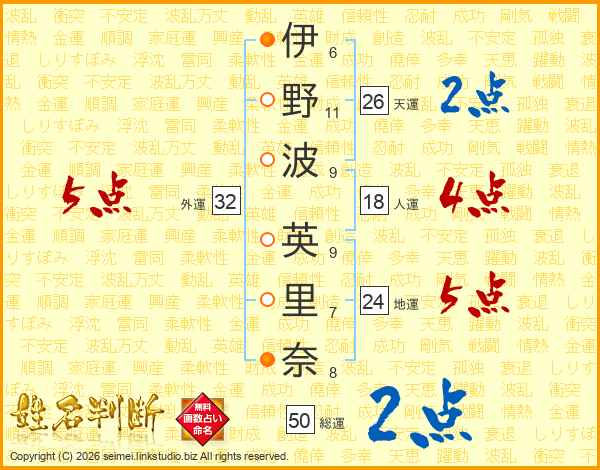 伊(6画)野(11画)波(9画) 英(9画)里(7画)奈(8画)
