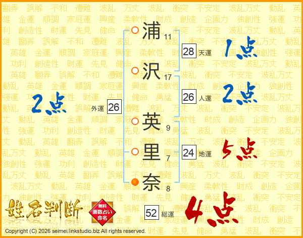 浦(11画)沢(17画) 英(9画)里(7画)奈(8画)