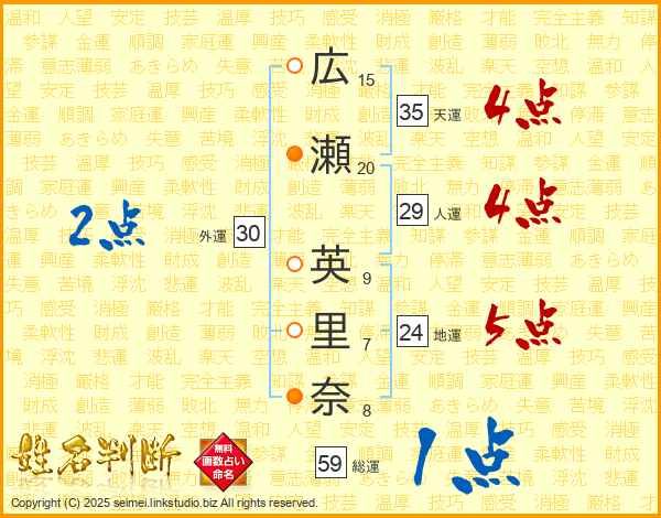 広(15画)瀬(20画) 英(9画)里(7画)奈(8画)