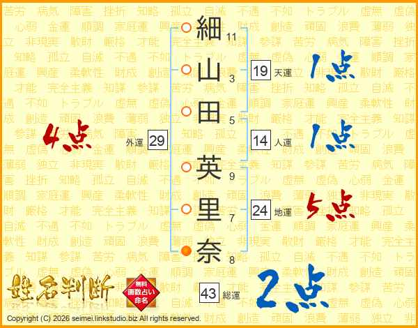 細(11画)山(3画)田(5画) 英(9画)里(7画)奈(8画)