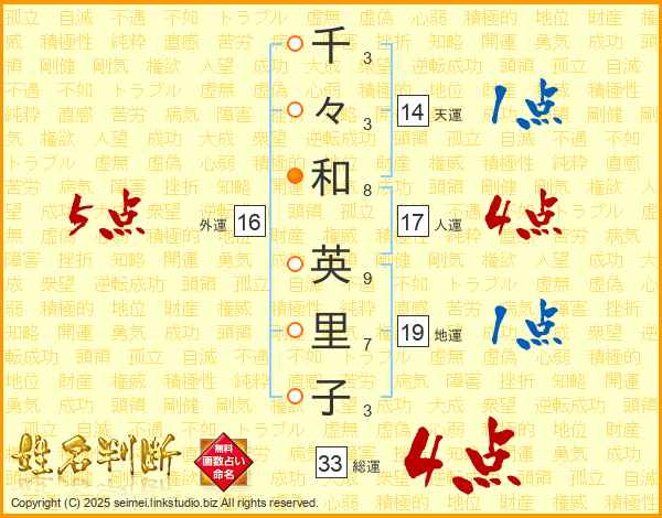 千(3画)々(3画)和(8画) 英(9画)里(7画)子(3画)