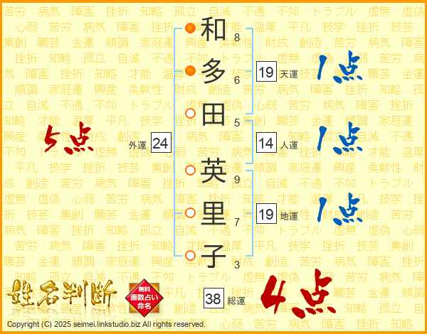和(8画)多(6画)田(5画)  英(9画)里(7画)子(3画)