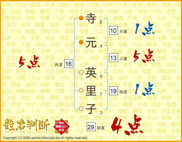 寺(6画)元(4画) 英(9画)里(7画)子(3画)