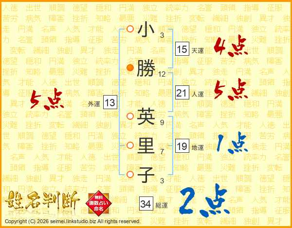 小(3画)勝(12画) 英(9画)里(7画)子(3画)