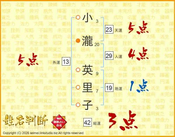 小(3画)瀧(20画) 英(9画)里(7画)子(3画)