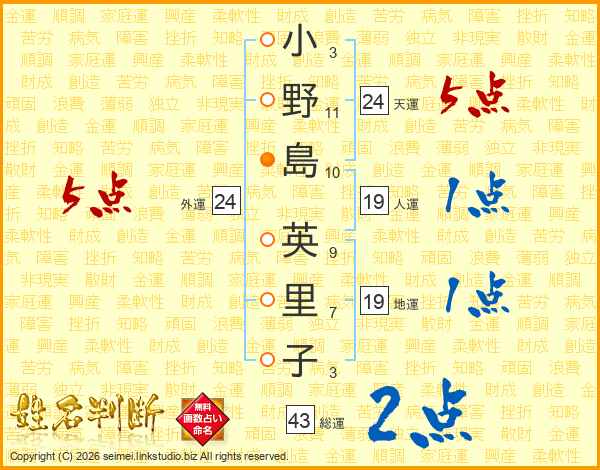 小(3画)野(11画)島(10画) 英(9画)里(7画)子(3画)