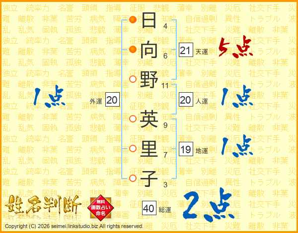 日(4画)向(6画)野(11画) 英(9画)里(7画)子(3画)