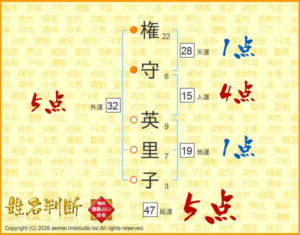 権(22画)守(6画) 英(9画)里(7画)子(3画)