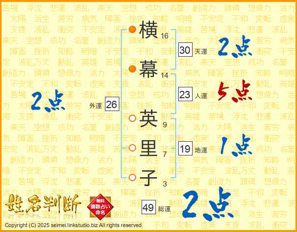 横(16画)幕(14画) 英(9画)里(7画)子(3画)