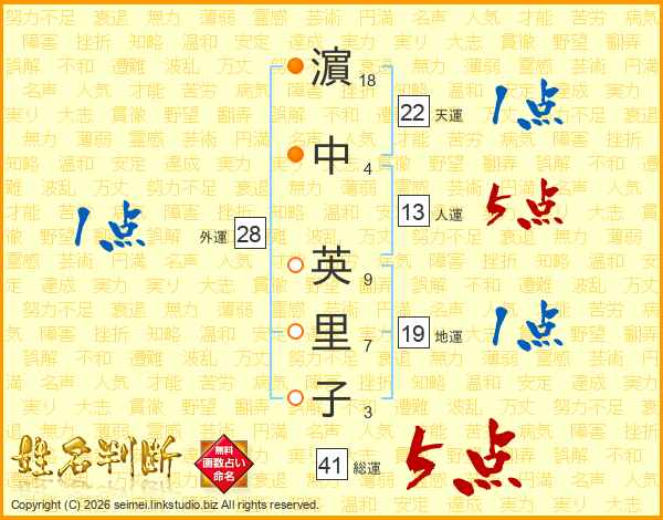 濵(18画)中(4画) 英(9画)里(7画)子(3画)