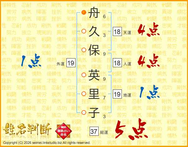 舟(6画)久(3画)保(9画) 英(9画)里(7画)子(3画)