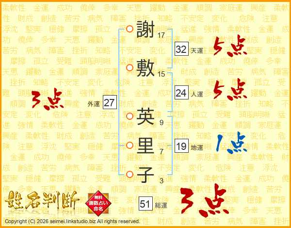 謝(17画)敷(15画) 英(9画)里(7画)子(3画)