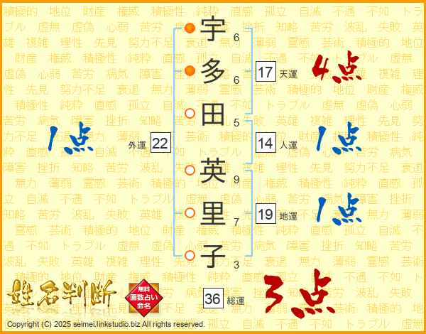 宇(6画)多(6画)田(5画)  英(9画)里(7画)子(3画)