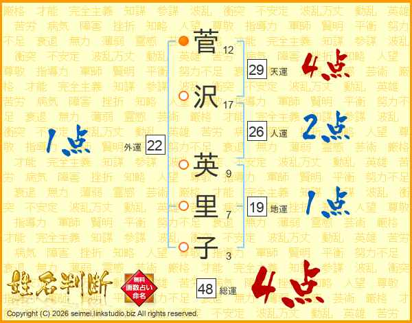 菅(12画)沢(17画) 英(9画)里(7画)子(3画)