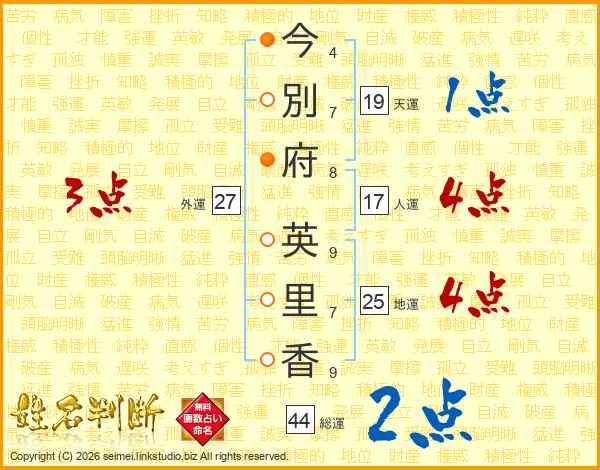 今(4画)別(7画)府(8画) 英(9画)里(7画)香(9画)