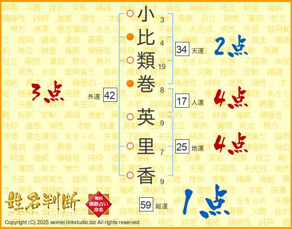 小(3画)比(4画)類(19画)巻(8画) 英(9画)里(7画)香(9画)