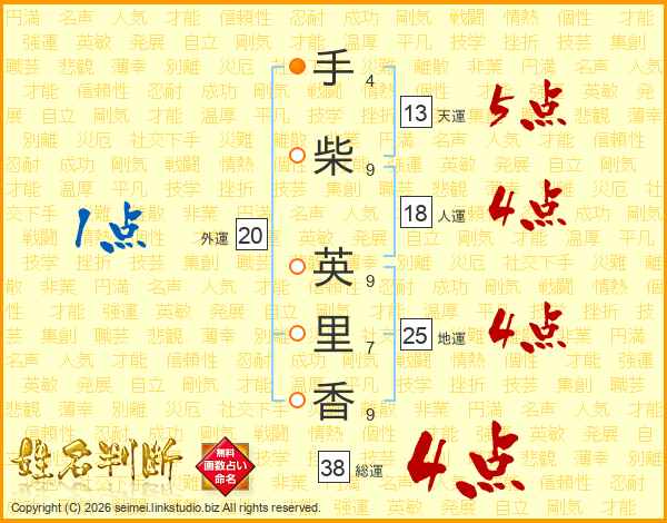 手(4画)柴(9画) 英(9画)里(7画)香(9画)