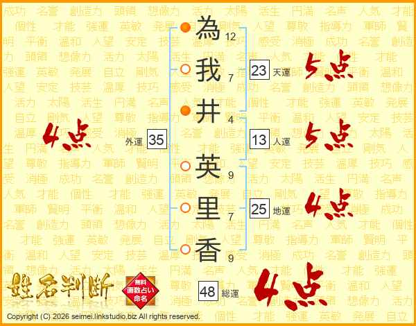 為我井英里香さんの人運は13画の5点!