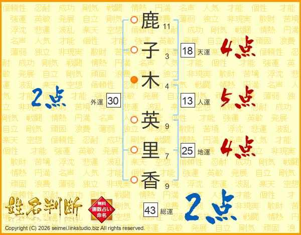 鹿(11画)子(3画)木(4画) 英(9画)里(7画)香(9画)