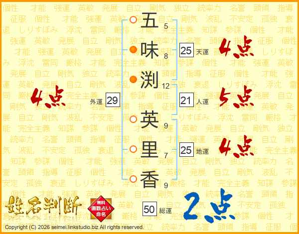 五(5画)味(8画)渕(12画) 英(9画)里(7画)香(9画)