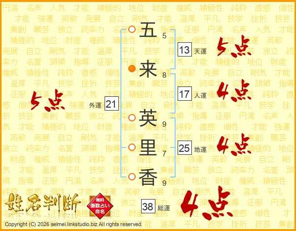 五来英里香さんの総運は38画の4点!