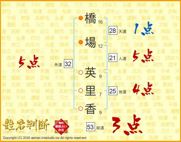 橋(16画)場(12画) 英(9画)里(7画)香(9画)
