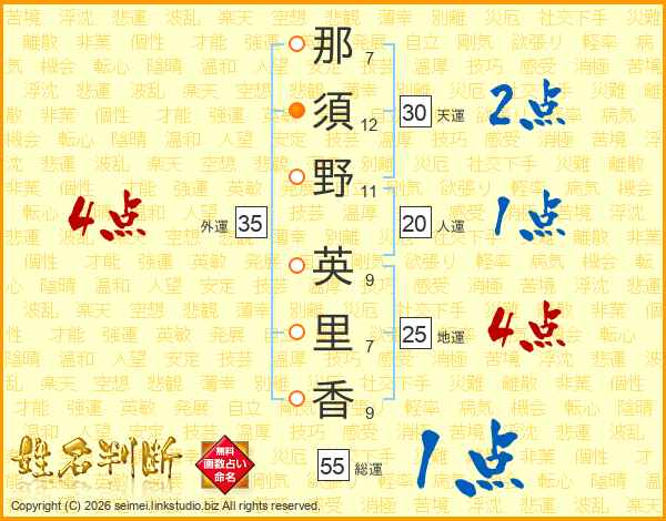 那(7画)須(12画)野(11画) 英(9画)里(7画)香(9画)